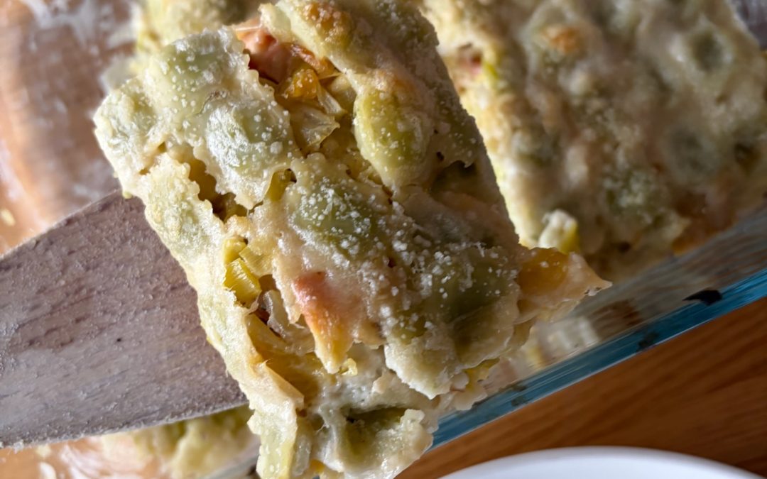 3) Dans un plat rectangulaire allant au four, disposer au fond du plat un peu de crème fraiche, puis 2 plaques de ravioles côte à côte, puis les poireaux à la truite, un peu de crème, puis 2 plaques de ravioles et ainsi de suite jusqu’à épuisement des 8 plaques de ravioles. Terminer par un peu de crème et de parmesan / gruyère ou emmental râpé.